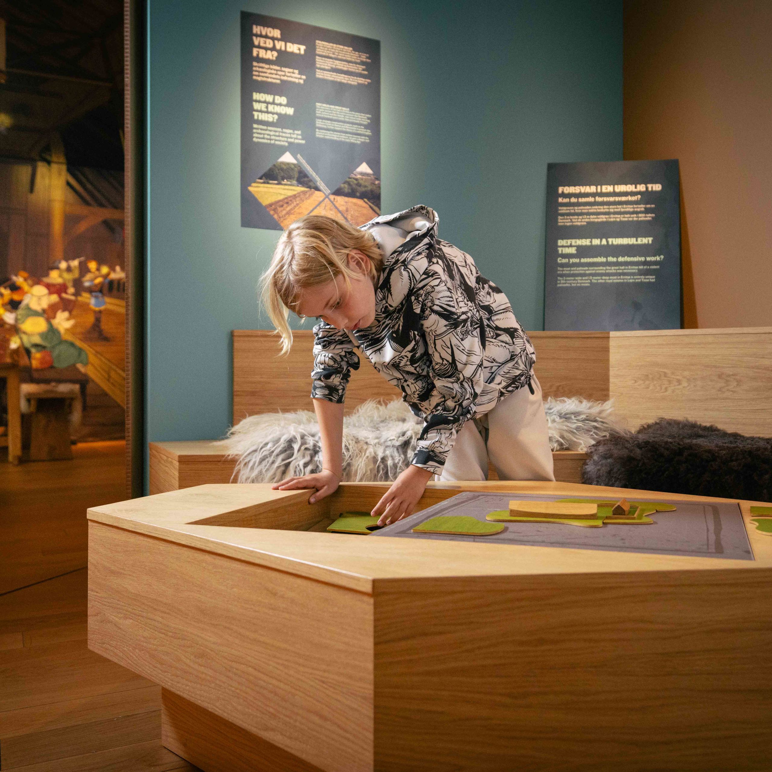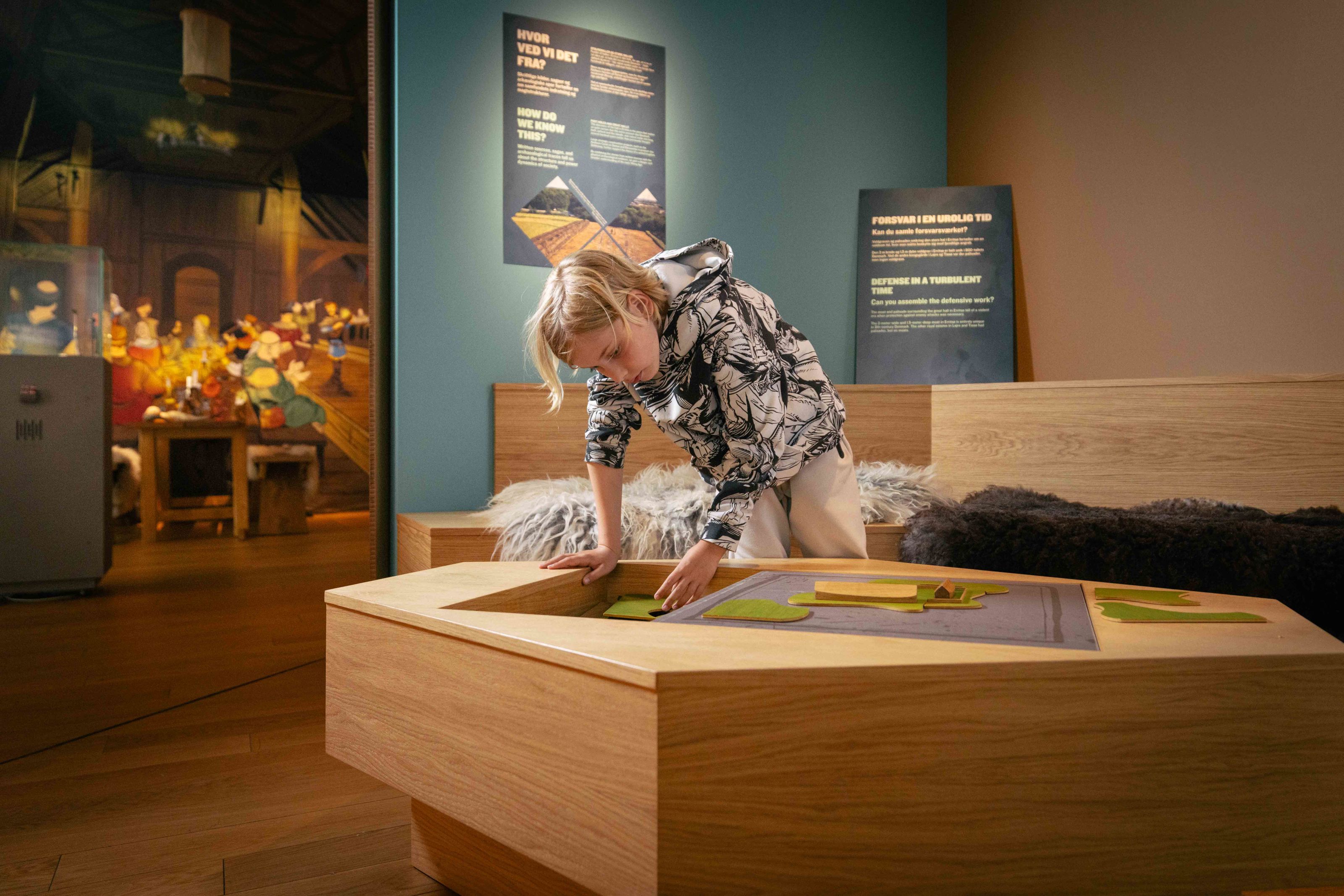 Hvis I trænger til at bruge kroppen og være aktive, kan I hoppe en tur i gravekassen og lege arkæolog for en dag med en af vores detektorer, lege lege fra gamle dage i Åsen og Måsen eller tage en af vores flip-flappere eller en kulturkuffert med rundt på opdagelse i udstillingerne og lave sjove aktiviteter sammen.